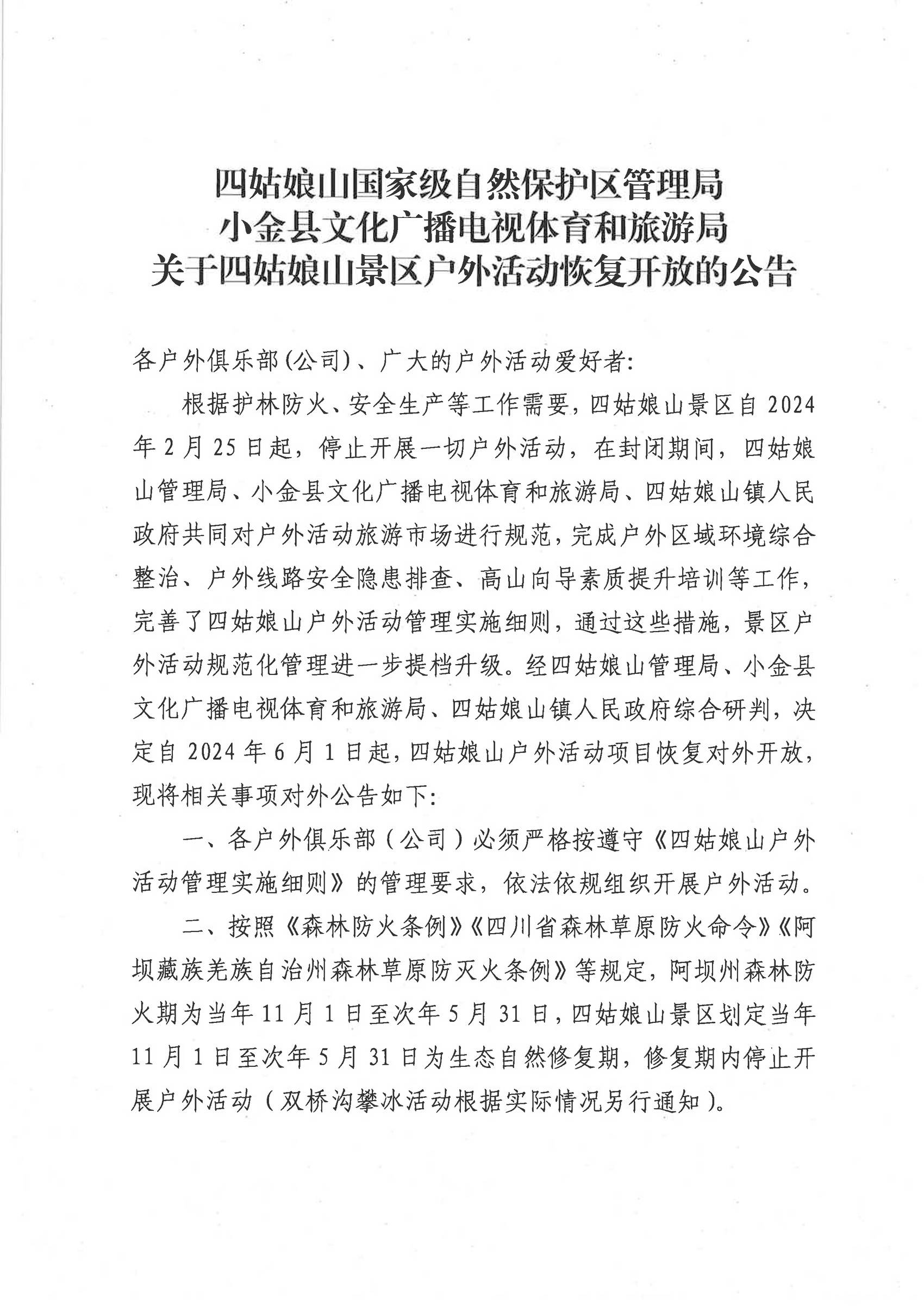 经四姑娘山管理局、小金县文化广播电视体育和旅游局、四姑娘山镇人民政府综合研判,决定自2024年6月1日起,四姑娘山户外活动项目恢复对外开放。公告要求各户外俱乐部(公司)必须严格遵守《四姑娘山户外活动管理实施细则》的管理要求,依法依规组织开展户外活动。