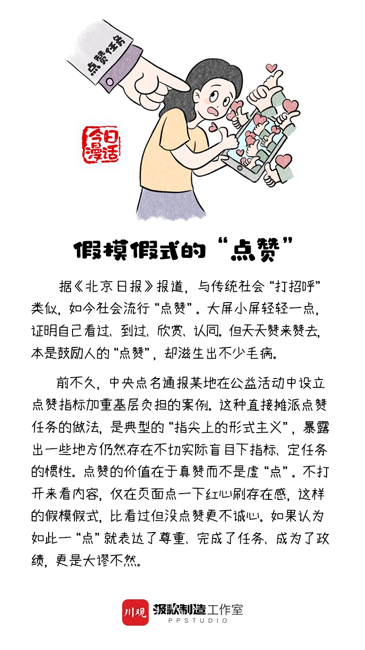 与传统社会“打招呼”类似,如今社会流行“点赞”。大屏小屏轻轻一点,证明自己看过、到过、欣赏、认同。但天天赞来赞去,本是鼓励人的“点赞”,却滋生出不少毛病。对此,你怎么看?
