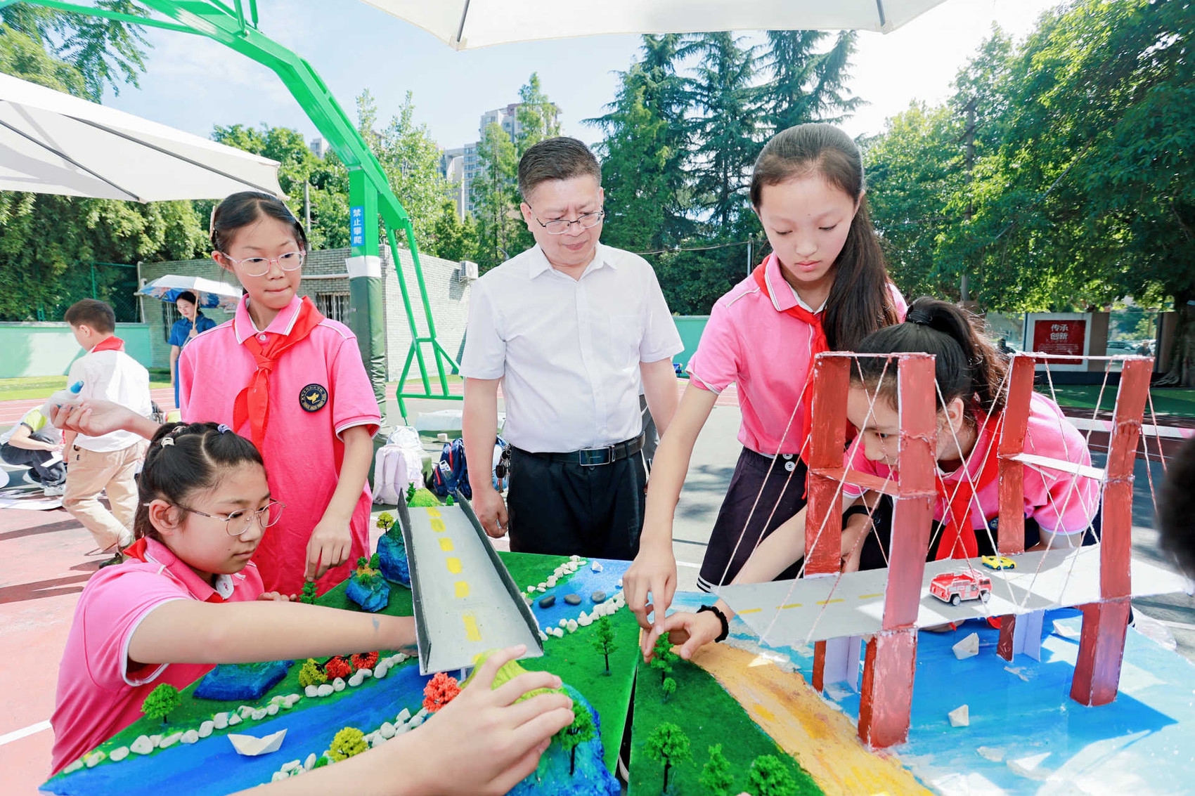 在桥梁造型比赛中,小选手们利用剪刀、胶水等工具,将模板、泡沫等材料制作成草木、房屋、隧道等个体单元,再将这些个体组合成山、河、湖、海、别墅、桥梁等完整模型,非常有趣。