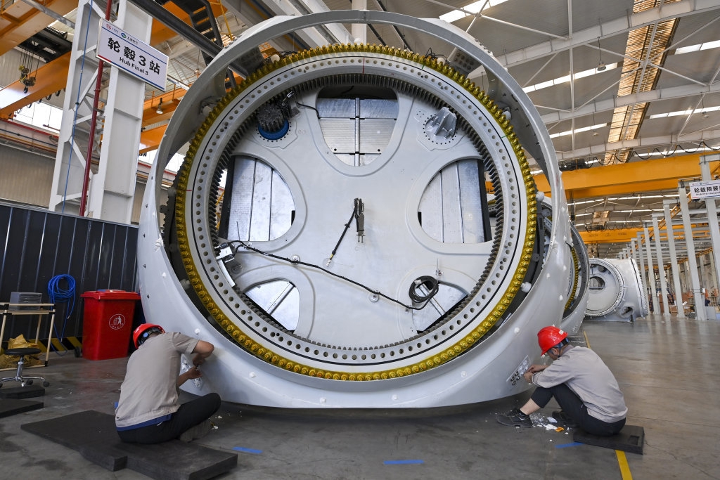 5月30日,工人在位于山西转型综合改革示范区的太重集团新能源产业园区对风电装备进行出厂前的检测。