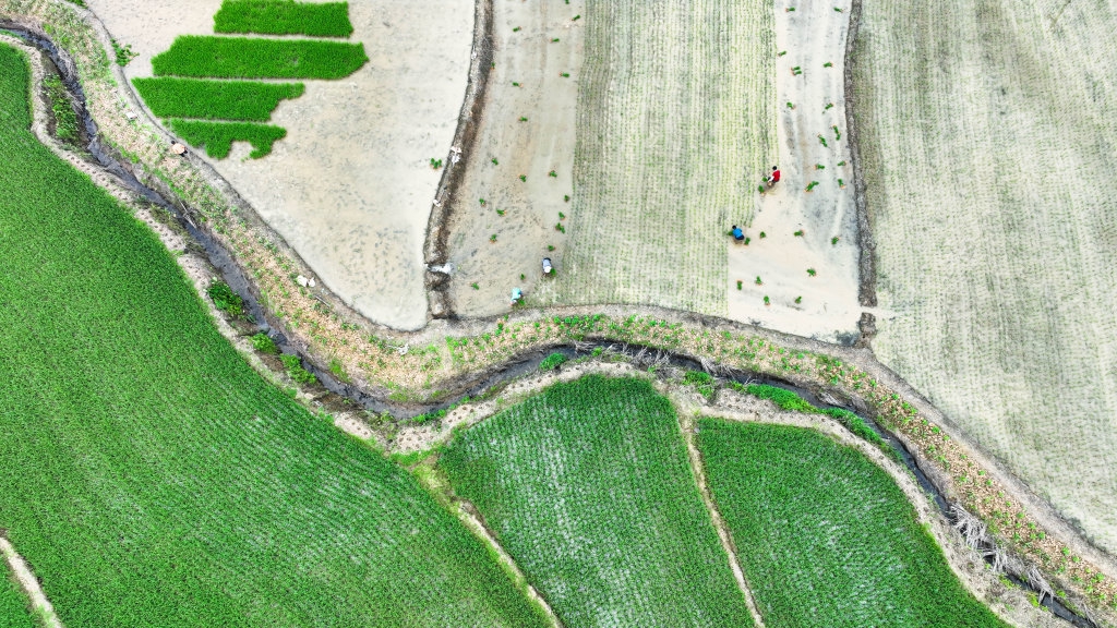 5月29日,湖南常宁市胜桥镇农民在田间插秧(无人机照片)。