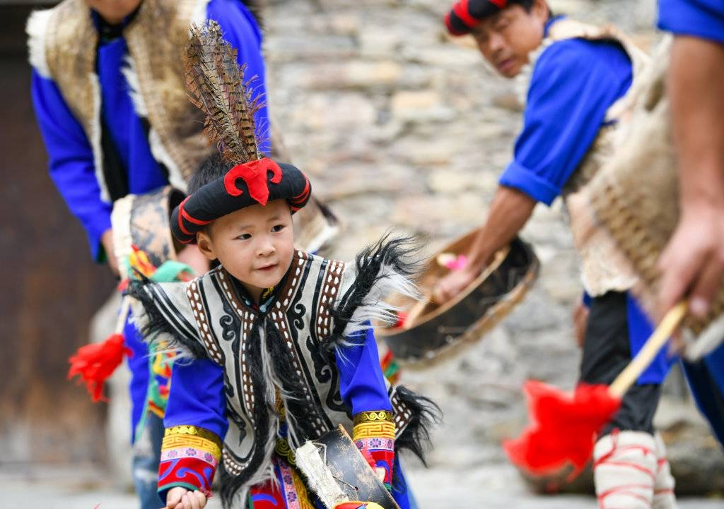 羌韵悠悠 3岁萌娃“玩转”羊皮鼓舞