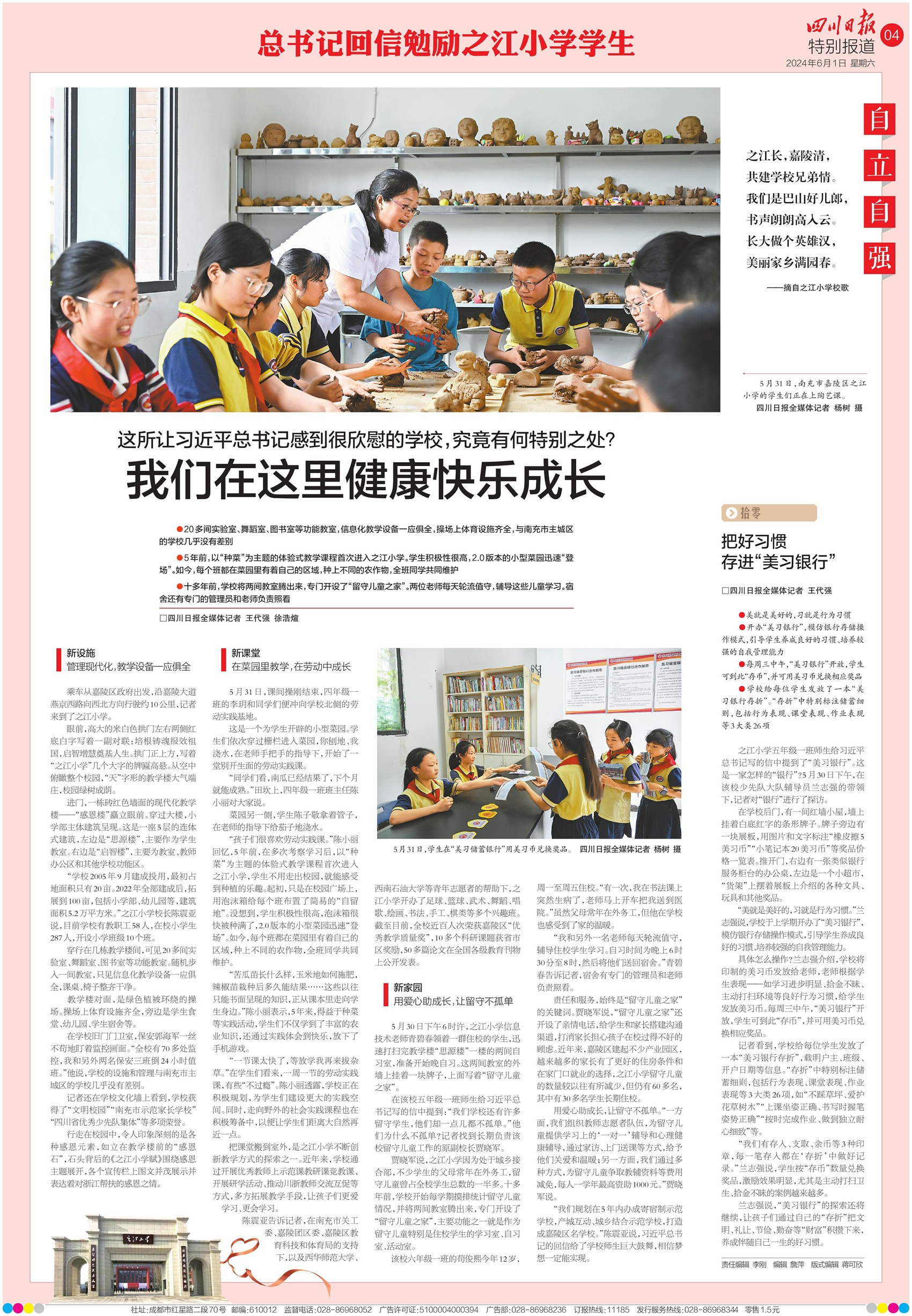 6月1日出版的《四川日报》推出特别报道,分别以感恩奋进、爱党爱国、自立自强、奋发向上为主题,讲述总书记回信的南充市嘉陵区之江小学和师生们的故事,展现四川广大干部群众感恩奋进、持续用力做好我省少年儿童工作,以广大少年儿童成长成才的良好局面回报习近平总书记和党中央关心关怀的强烈反响。