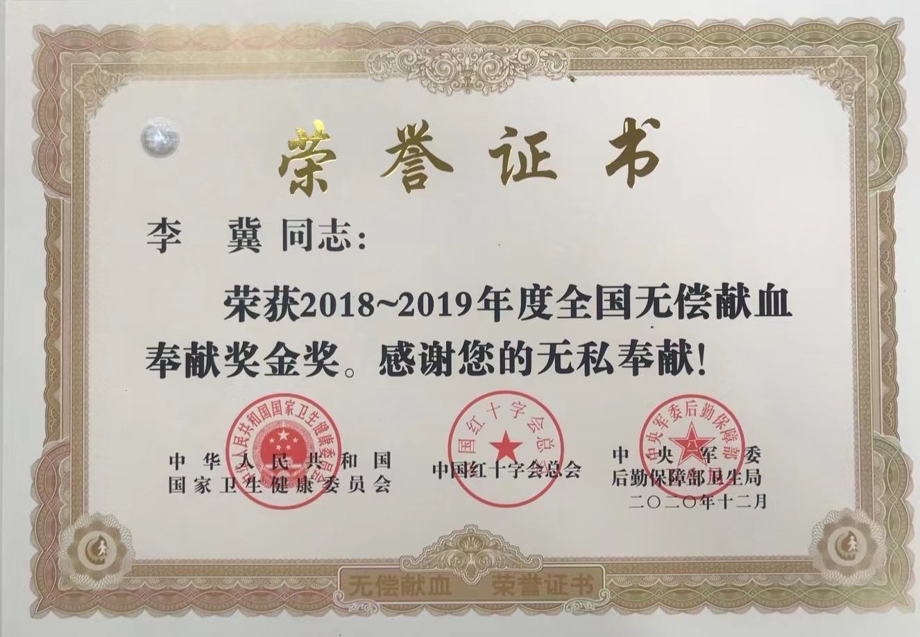 李冀多次获得全国无偿献血奉献奖
