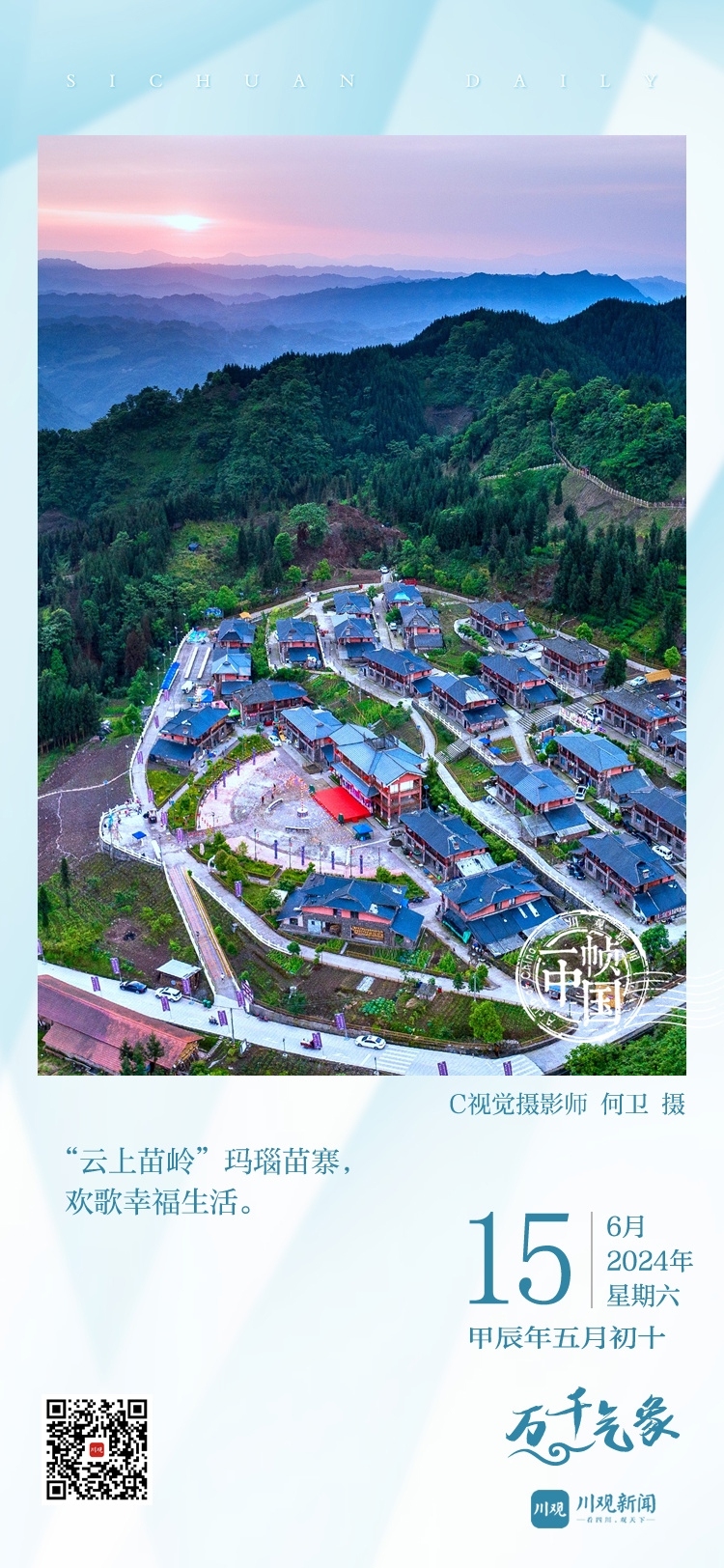 今天的《一帧中国》,川观新闻带您走进马边彝族自治县玛瑙村,欣赏玛瑙苗寨日出。玛瑙苗寨位于玛瑙村的高山区,坐落于金沙江、岷江的两江分水岭之上,使得这里常年云雾缭绕、景色宜人,故有“云上苗岭”之美誉。