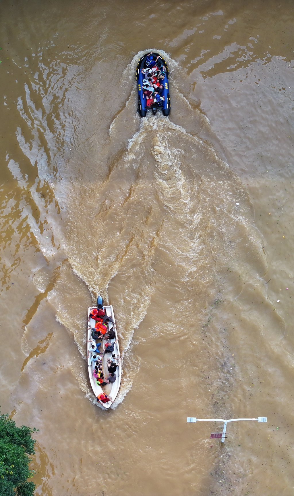 6月20日,在桂林市上海路,救援人员驾驶橡皮艇和冲锋舟转移被困居民(无人机照片)。