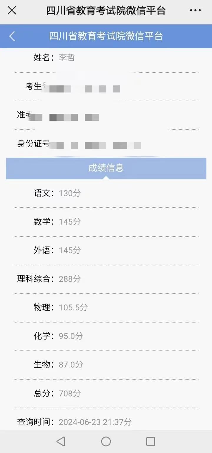 6月23日晚,2024年四川高考成绩已经可以查询。记者获悉,四川泸州天立学校理科考生李哲在高考中考出708分的好成绩。其中,语文130分,数学145分,外语145分,理综288分。