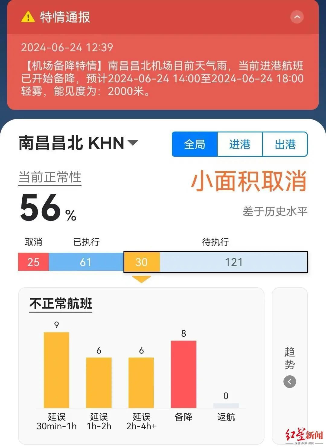 而南昌昌北国际机场也有25班次进出港航班取消,有8班次航班出现备降。成都直飞南昌航班出现延误、取消或备降的达到50%。
