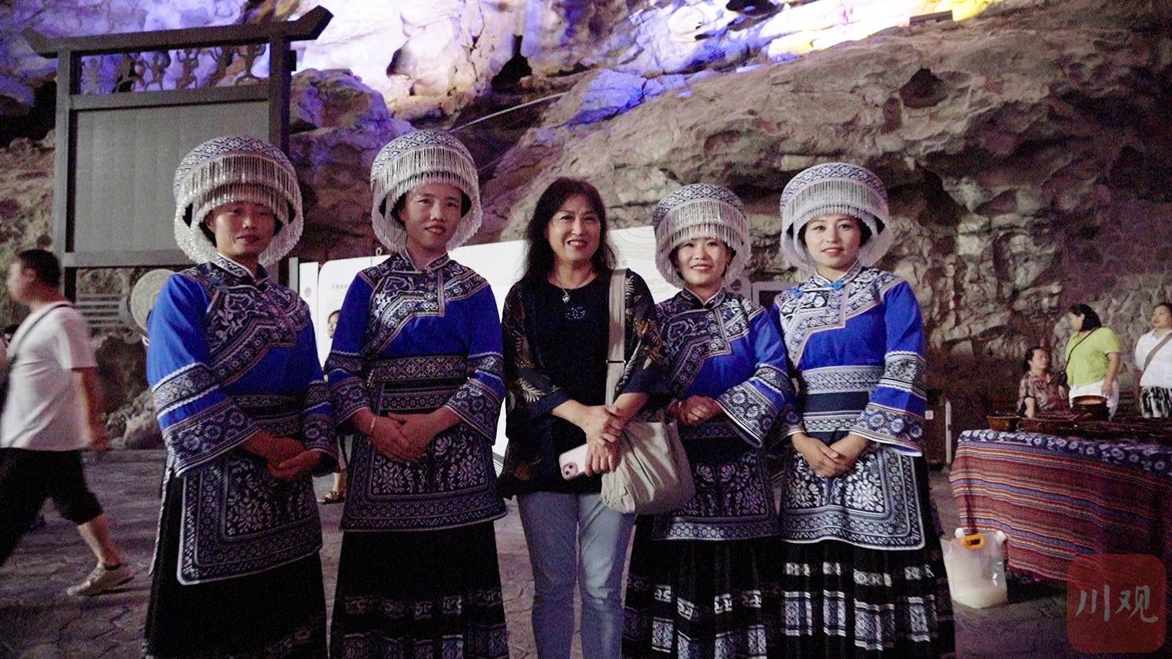 台湾自媒体人同景区内身穿苗族服饰的演职人员合影
