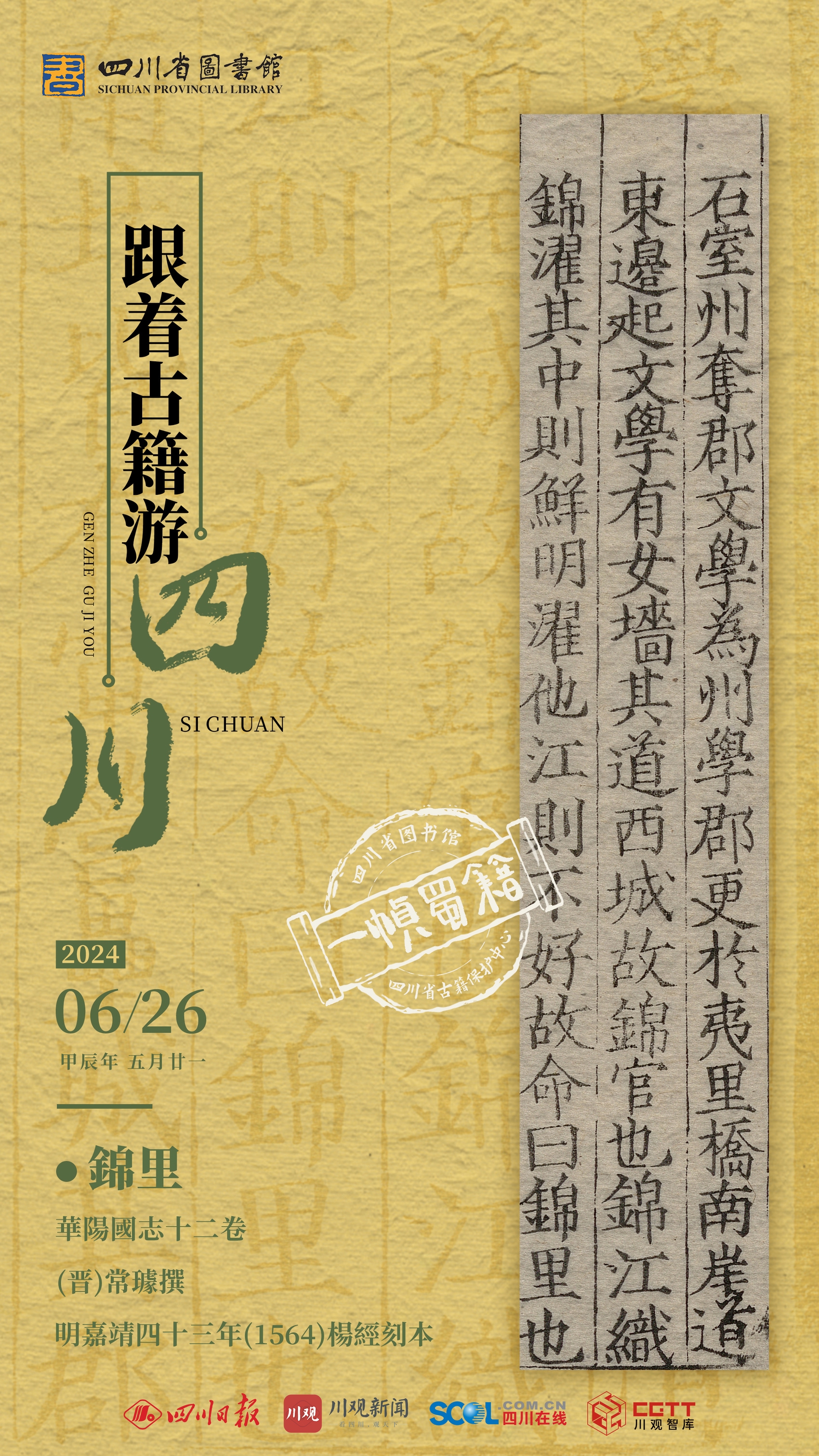 6月26日,一帧蜀籍带你漫步古街锦里。海报图所选用的版本为《华阳国志》十二卷,(晋)常璩撰,明嘉靖四十三年(公元1564年)杨经刻本。