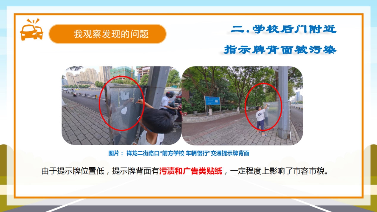 “为了完成这个作品,我专门做了调研。我认为,梓州大道辅道部分路口现有提示牌位置不够显眼,部分指示牌不太清晰甚至有污染。希望能够在学校周边特定位置增设‘前方学校 车辆慢行’提示牌,保障上下学安全。”在优秀获奖案例路演展示环节,成都师范银都紫藤小学学生向秋辰建议。目前,他的建议已被高新区交管部门采纳。活动现场,共有七个路演团队介绍了他们的建议与解决方案,评审专家也为路演小选手们提出的建议分析点评。