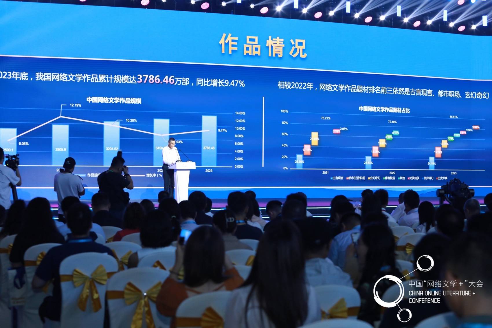 开幕式上,《2023年度中国网络文学发展报告》发布。《报告》显示,2023年中国网络文学市场营收规模达到383.0亿元,同比增长20.52%;网络文学作品累计规模达3786.46万部,同比增长9.47%,相较2022年,网络文学作品题材排名前三依然是古言现言、都市职场、玄幻奇幻;网络文学IP改编量为72674部;网络文学行业海外市场营收规模43.50亿元,同比增长7.06%,我国网络文学出海作品(含网络文学平台海外原创作品)总量约为69.58万部(种),同比增长29.02%;截至2023年底,我国网络文学平台驻站作者总数约为2929.43万人,中青年作者依然是网络文学创作的绝对主力;网络文学用户规模达到5.5亿,较2022年增长了5200万人。