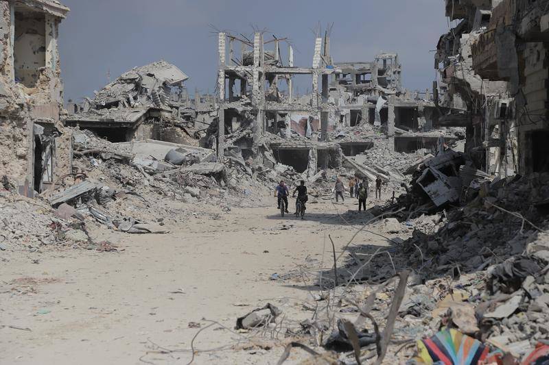 7月11日,在加沙城舒加艾耶社区,民众穿过废墟。