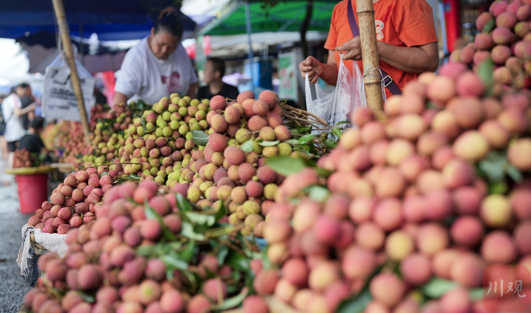 7月16日,泸州市合江县马街荔枝交易市场,上市的大红袍、妃子笑、绛纱兰等晚熟荔枝摆满了街道两边,消费者正在挑选采购。