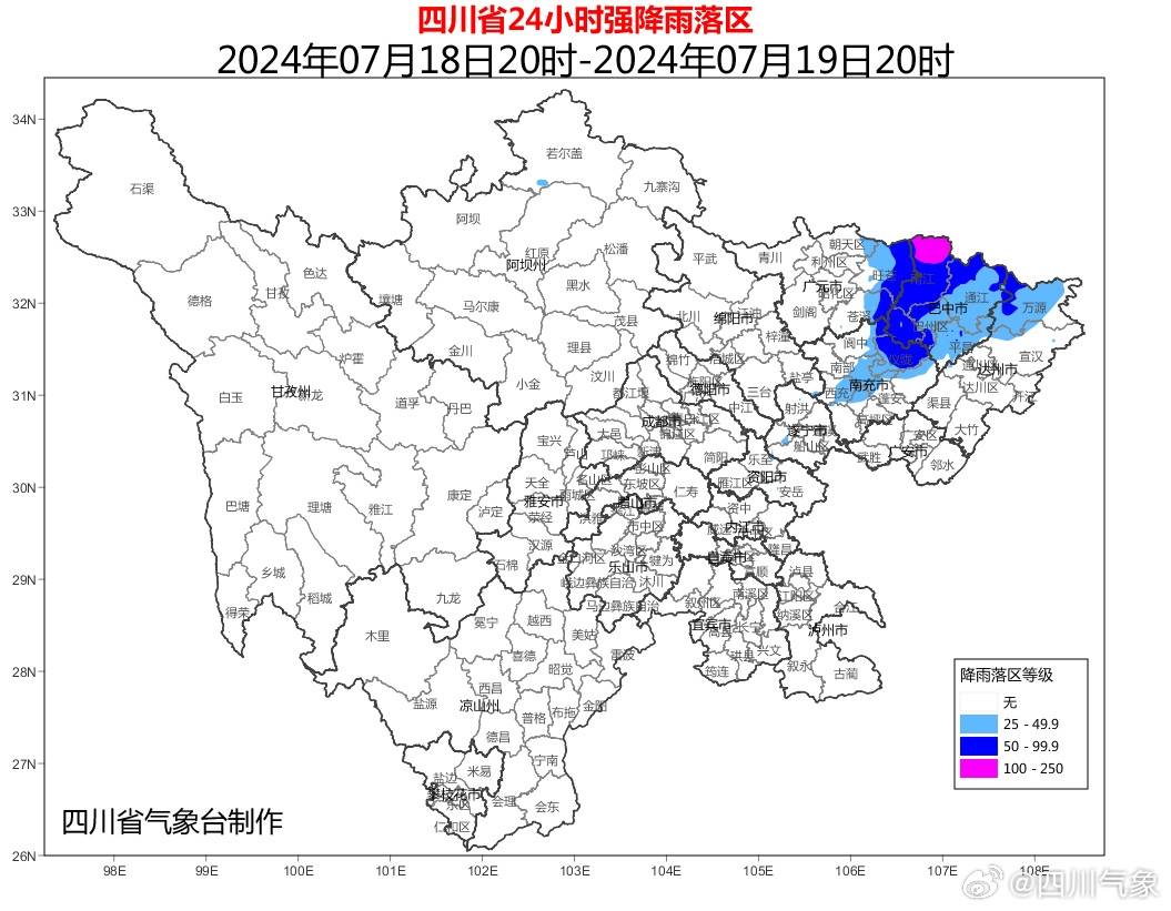 四川省气象台7月18日15时55分发布暴雨蓝色预警:7月18日20时到19日20时:巴中、广元东部、南充北部、达州北部有大雨到暴雨(雨量30~80毫米),局地有大暴雨(120~150毫米),最大小时雨量30~50毫米。