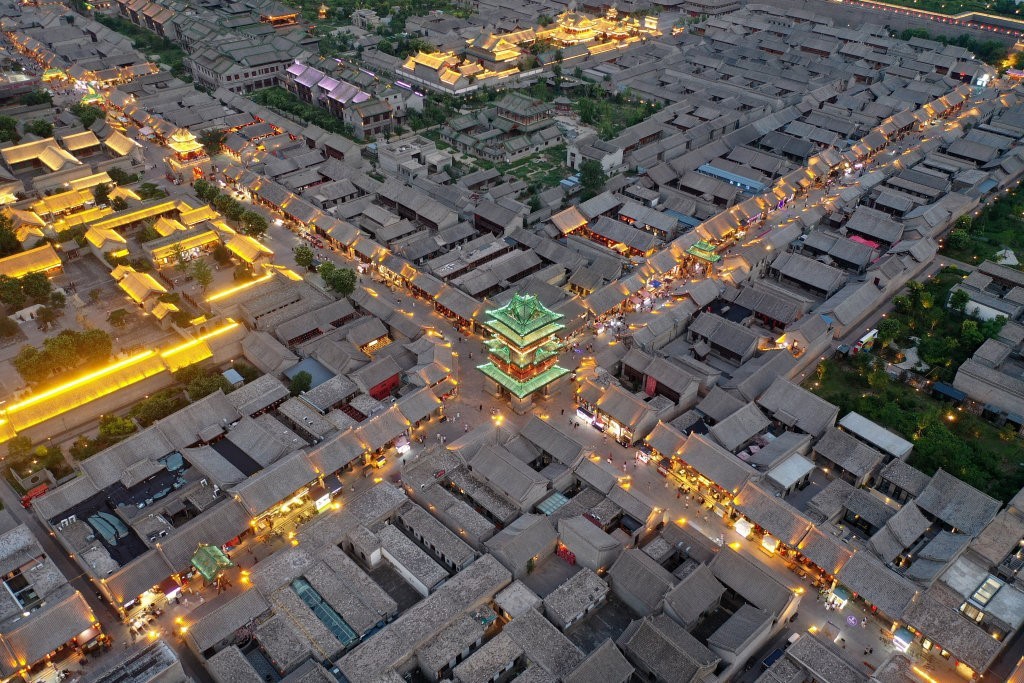 夜幕降临,位于山西省太原市晋源区的太原古县城灯光璀璨,夜景迷人,成为市民和游客消夏纳凉、夜游观光的好去处。
