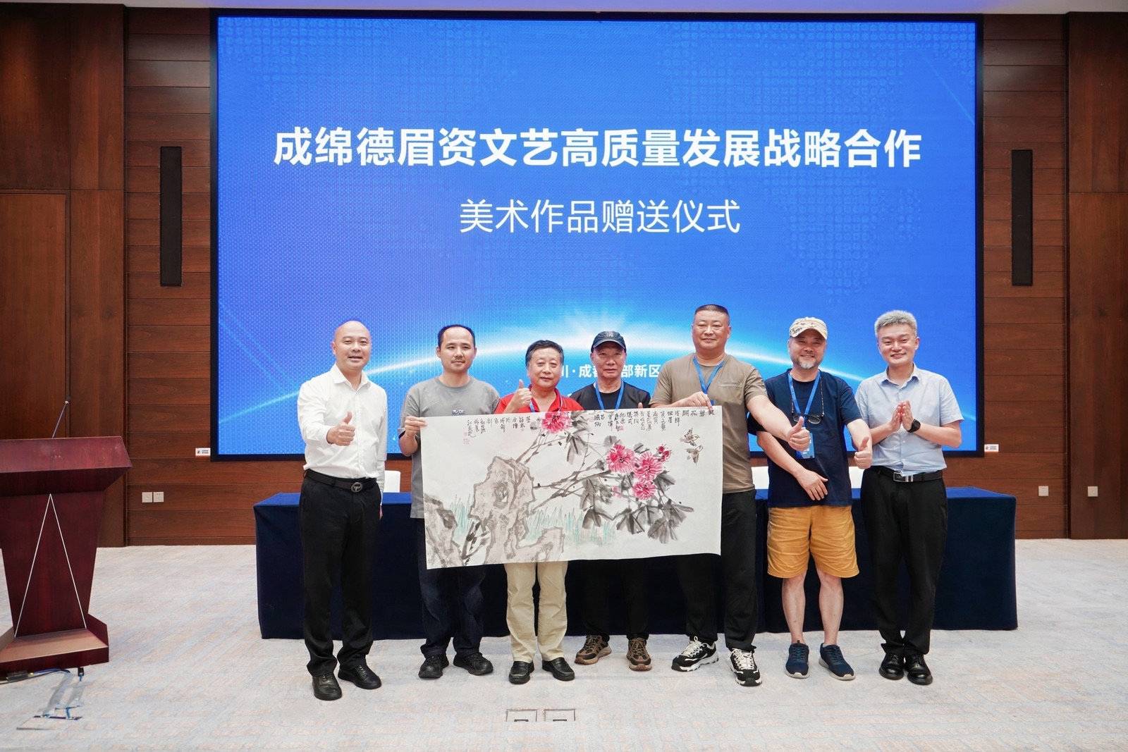 现场,来自成都、绵阳、德阳、眉山、资阳五市文联艺术家挥毫泼墨,用精湛的技艺在宣纸上勾勒出一幅幅生动的画卷,赠与成都东部新区党工委。签约仪式前,参会人员一行先后参观了2024成都世园会主会场、成都东部新区规划馆及東·壹·美术馆。