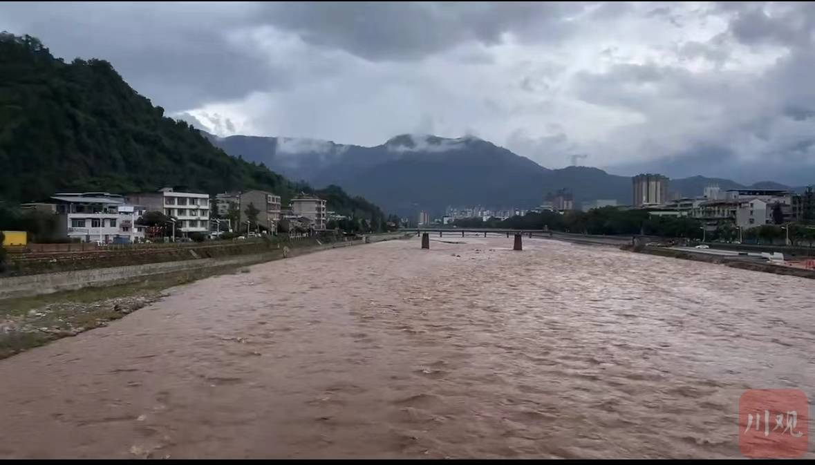雅安市荥经县的荥河正受强降雨影响水位上涨(廖诗雪 摄)