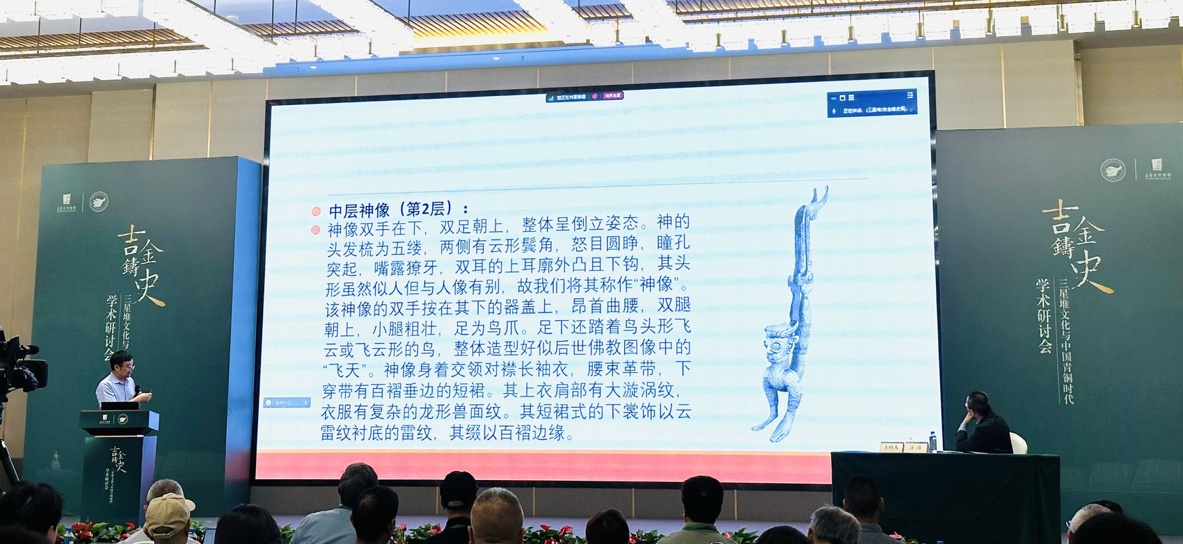 7月23日,由四川广汉三星堆博物馆、四川省文物考古研究院主办的“吉金铸史——三星堆文化与中国青铜时代学术研讨会”在德阳广汉举行。会上,北京大学考古文博学院教授、三星堆研究院学术院长孙华,对这件青铜瑰宝进行了再“详解”。在他看来,青铜器最上端的青铜立人,很可能就是三星堆国家的国王,同时也传递出一个信息——三星堆国家的绝对王权已经形成。