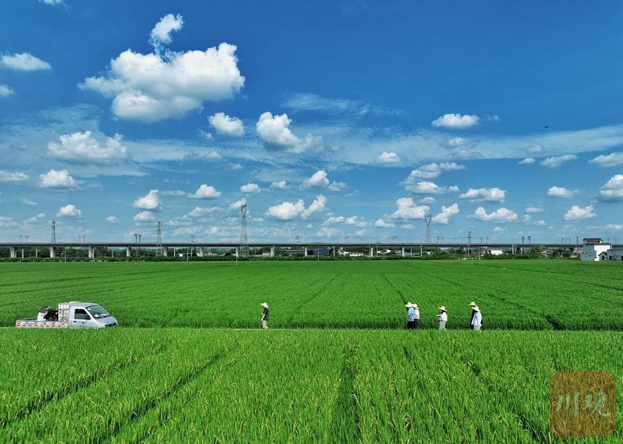 清风吹拂,村旁的高铁不时飞驰而过。眉山市东坡区永丰村的稻田,像画布一样向远方延伸,阵阵稻浪随风起伏。