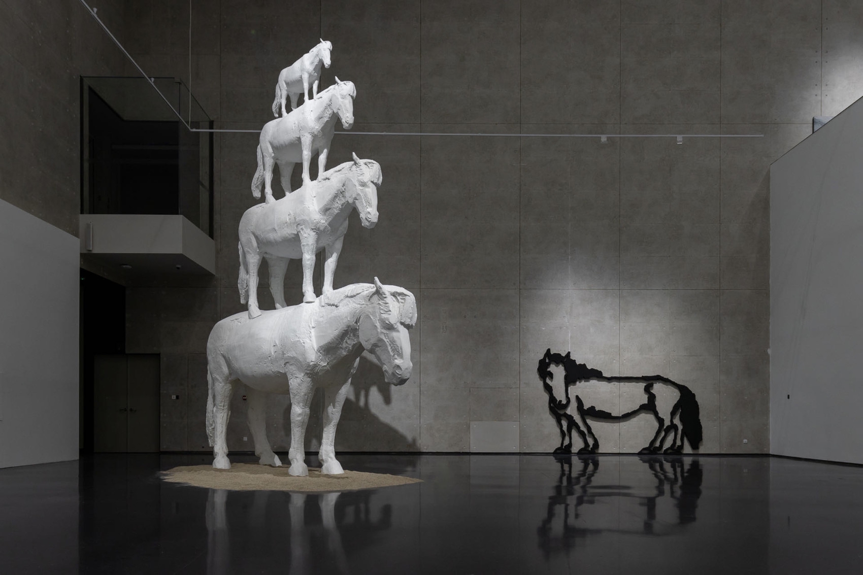 此次展览共分为4个单元。走进开篇“现代的部落”,尺寸巨大的蒙古包装置,以马和人为主题的雕塑作品迎面而来,带领观众回溯艺术家的故乡草原情怀,映照游牧文化在现代城市的困境与变迁。此版块还特别展出苏新平专门为成都市美术馆B区空间创作的全新大型装置作品。