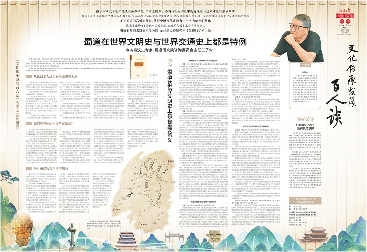 四川日报全媒体“文化传承发展百人谈”大型人文融媒报道持续推出,今日《四川日报》连版推出第四十四期,专访秦汉史专家、蜀道研究院咨询委员会主任王子今。