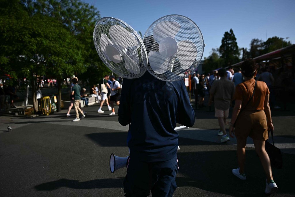 7月29日,在法国巴黎,一名男子抱着电扇行走。