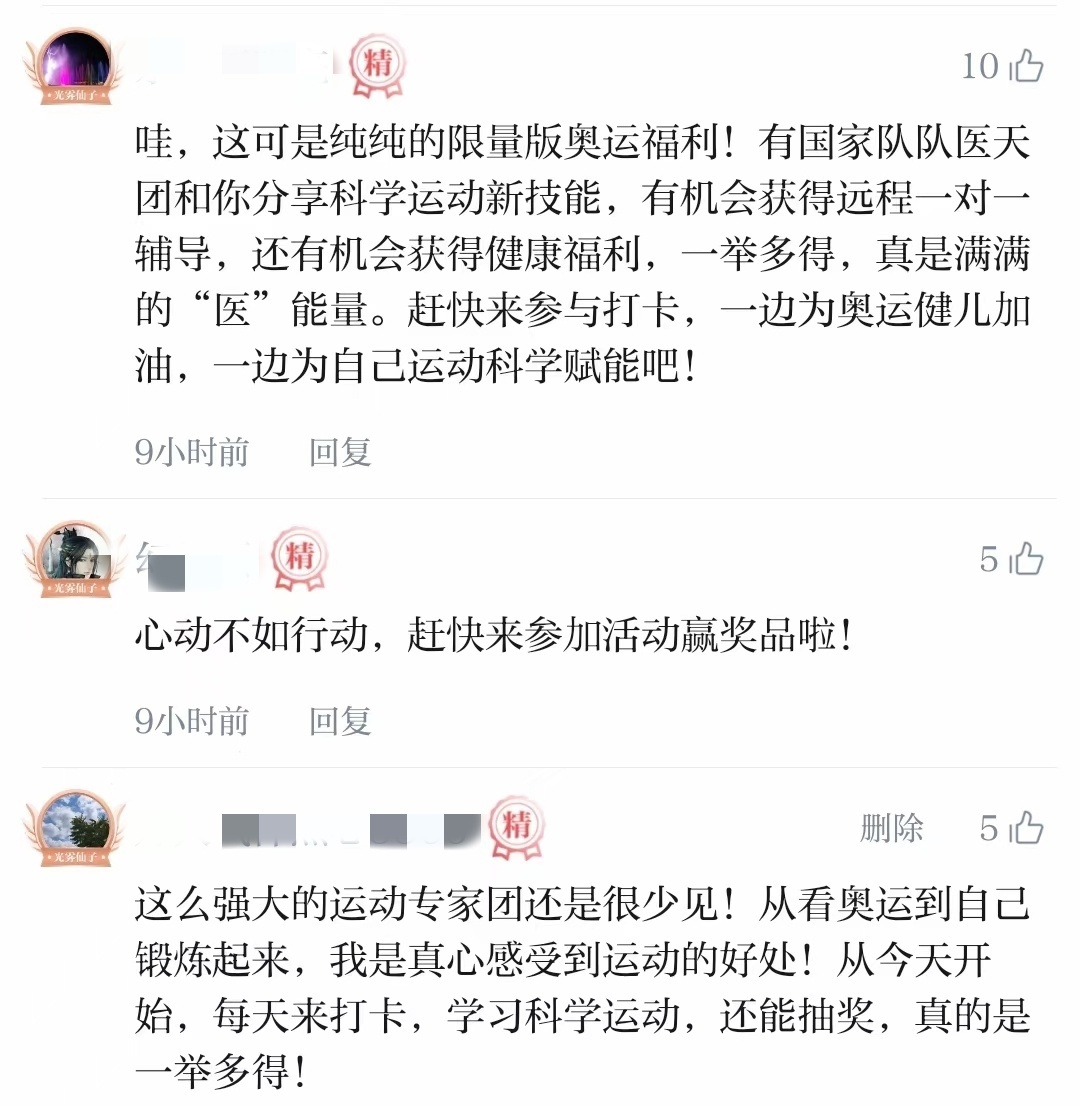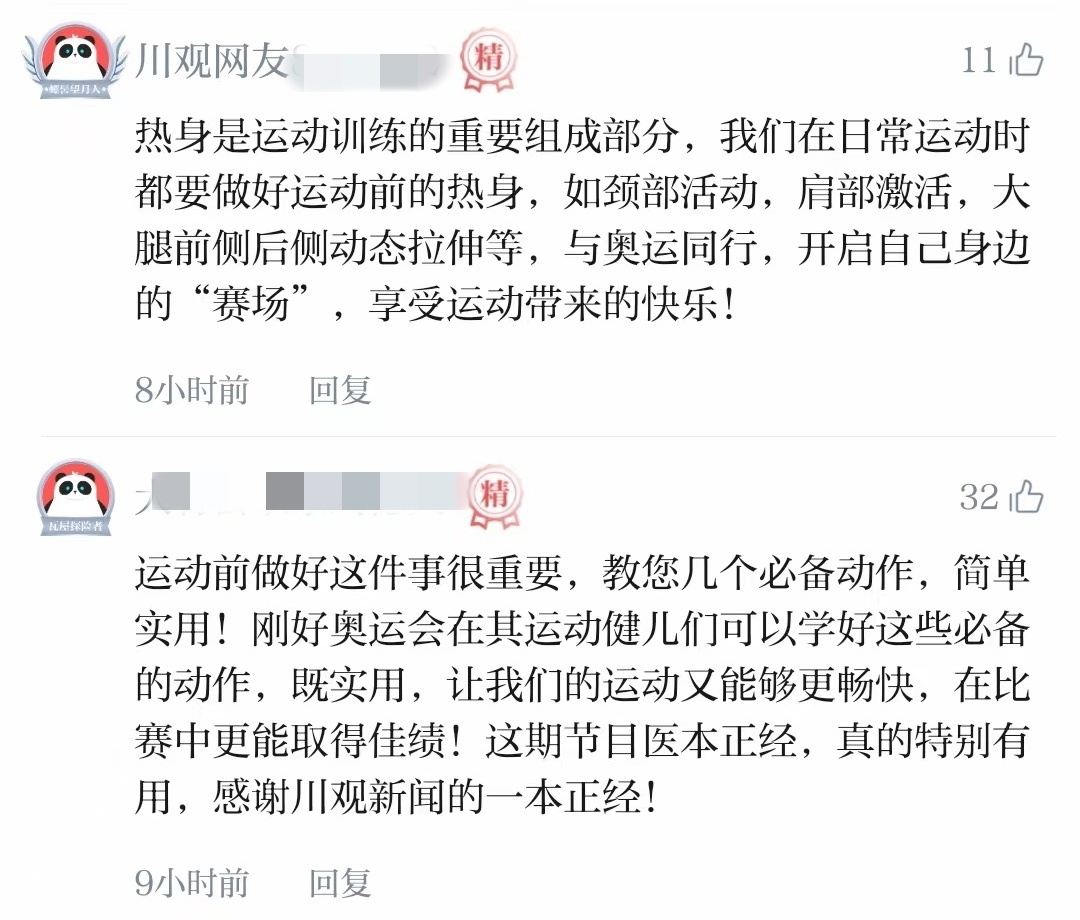 7月27日至8月11日,川观新闻携手四川省骨科医院、成都体育学院附属体育医院推出“与奥运同行,打卡赢好礼”活动,每天都有国家队队医等专业医生与大家分享科学运动新技能。(点击参看:与奥运同行,打卡赢好礼!国家队队医与您分享科学运动新技能)活动推出后,得到网友们留言好评。