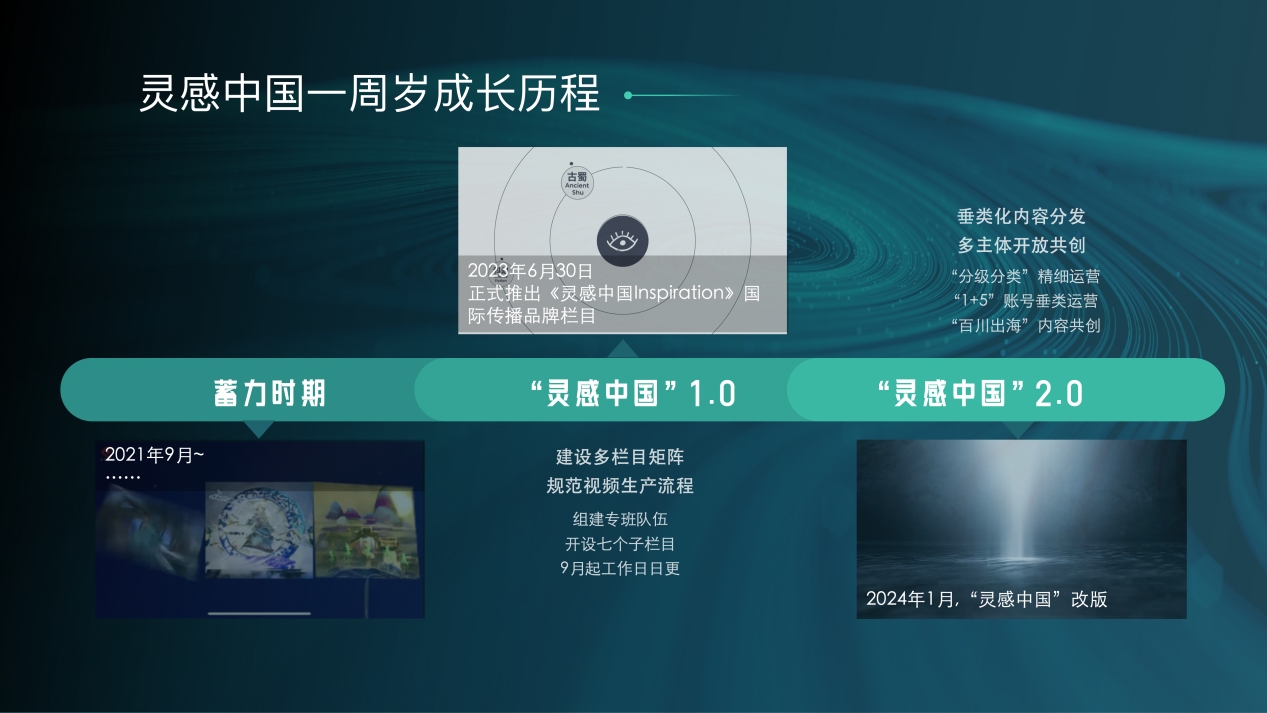 一年时间,“灵感中国”原创多语种精品节目超200期,自有账号矩阵海外粉丝量突破120万,入驻平台合作账号海外粉丝量突破1100万,获美联社、彭博社等400余家主流媒体新闻网站转发,3次登上推特全球热门,海外传播量超3亿,总曝光量超51亿。先后20多次登上微博、B站、抖音全国热搜,摘得2023“讲好中国故事”创意传播国际大赛特等奖,入选2023中国正能量网络精品,入选第四届中国报业深度融合发展创新案例。