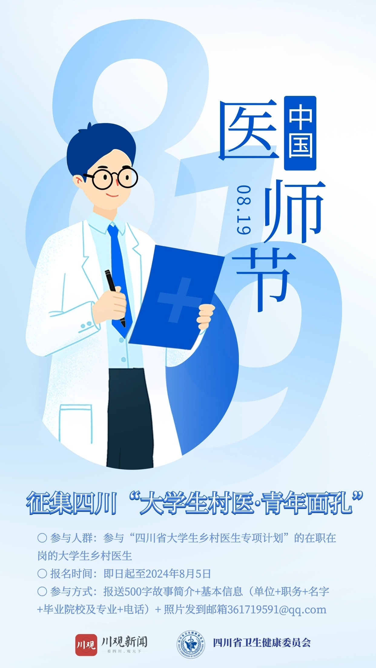 即日起至8月5日,川观新闻联合四川省卫生健康委员会发起四川“大学生村医·青年面孔”线上征集活动,欢迎以自荐或他荐方式提供500字以内的故事简介以及照片,我们将从中选出一批新生代村医进行深入挖掘。