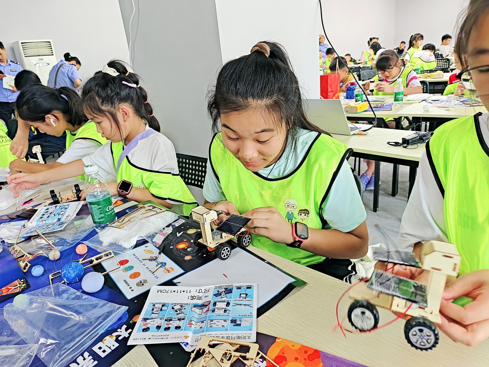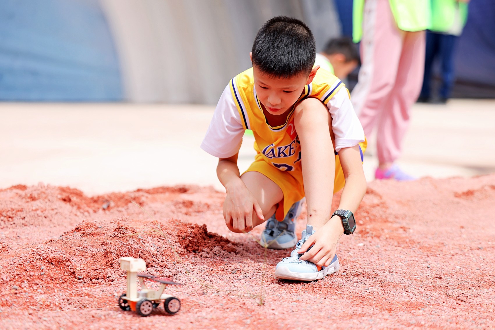 站在“宇宙之眼”,纵观人类航天;驻足“太空漫游展厅”,感受“弹、箭、星、船、器”无限魅力……中国独有的“天宫”空间站的建造,让同学们对“自力更生、自主创新”的航天精神有了更直观的体会。同学们还充分发挥想象力和创造力,亲手捏制出属于自己的星球;他们制作的太阳能月球车,在阳光下快乐奔跑。