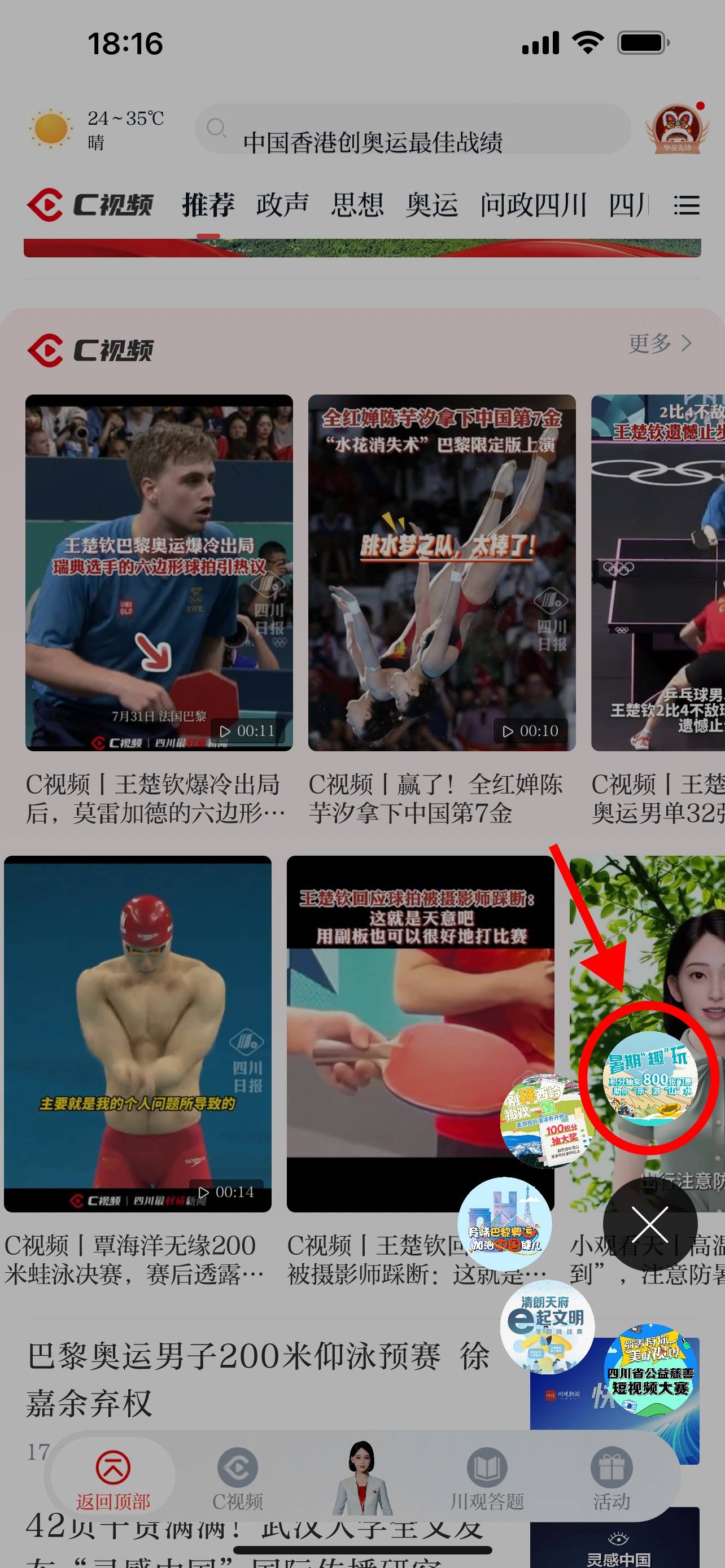 2.在川观新闻首页,点击右下角“活动”,进入活动中心,找到暑期“趣”玩活动图片,点击即可参与活动;