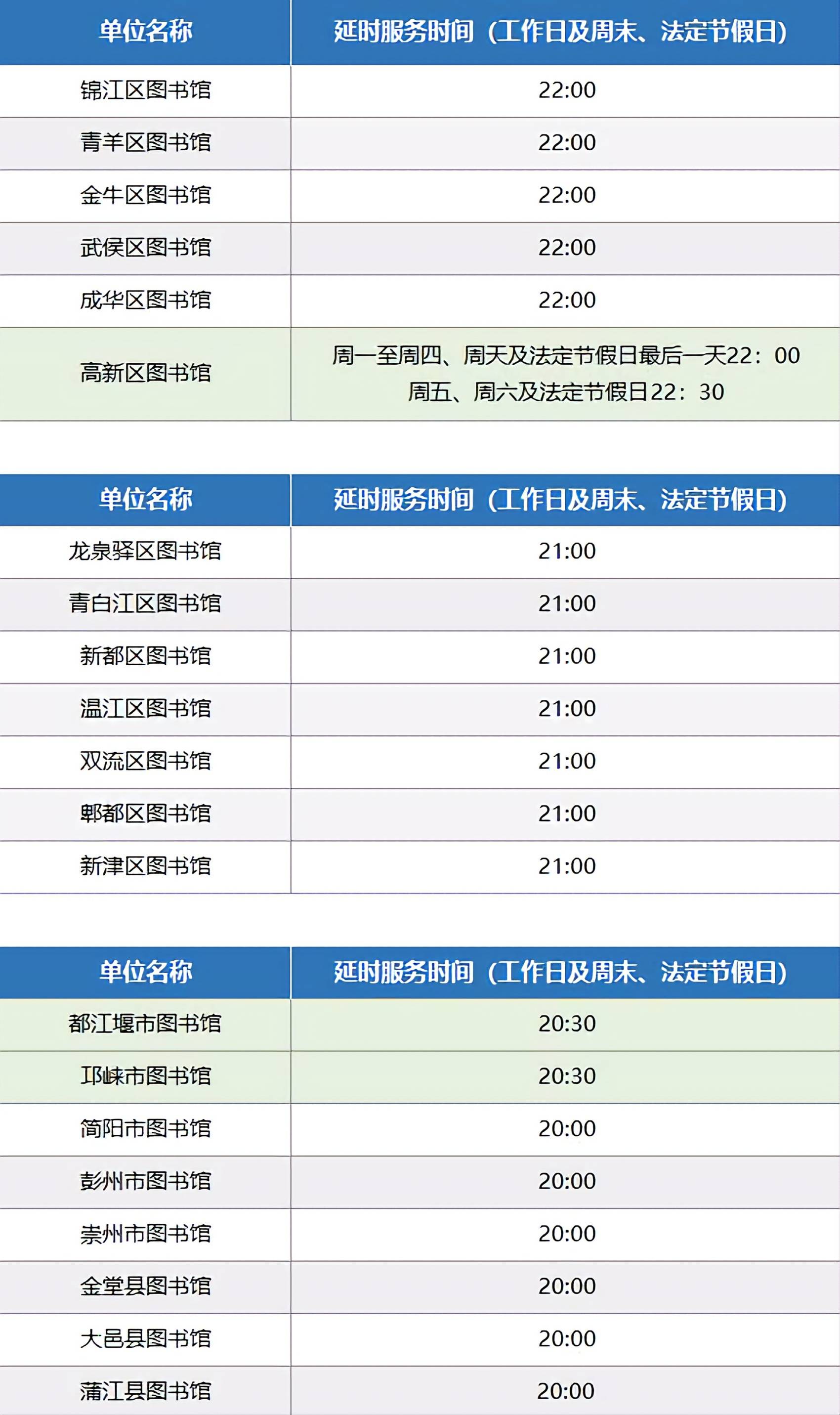 在6个中心城区公共图书馆中,锦江区、青羊区、金牛区、武侯区、成华区从8月1日起,工作日及周末、法定节假日开放时间延长至 22:00,高新区图书馆周一至周四、周天及法定节假日最后一天延长至22:00,周五、周六及法定节假日延长至22:30。