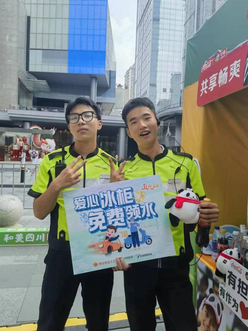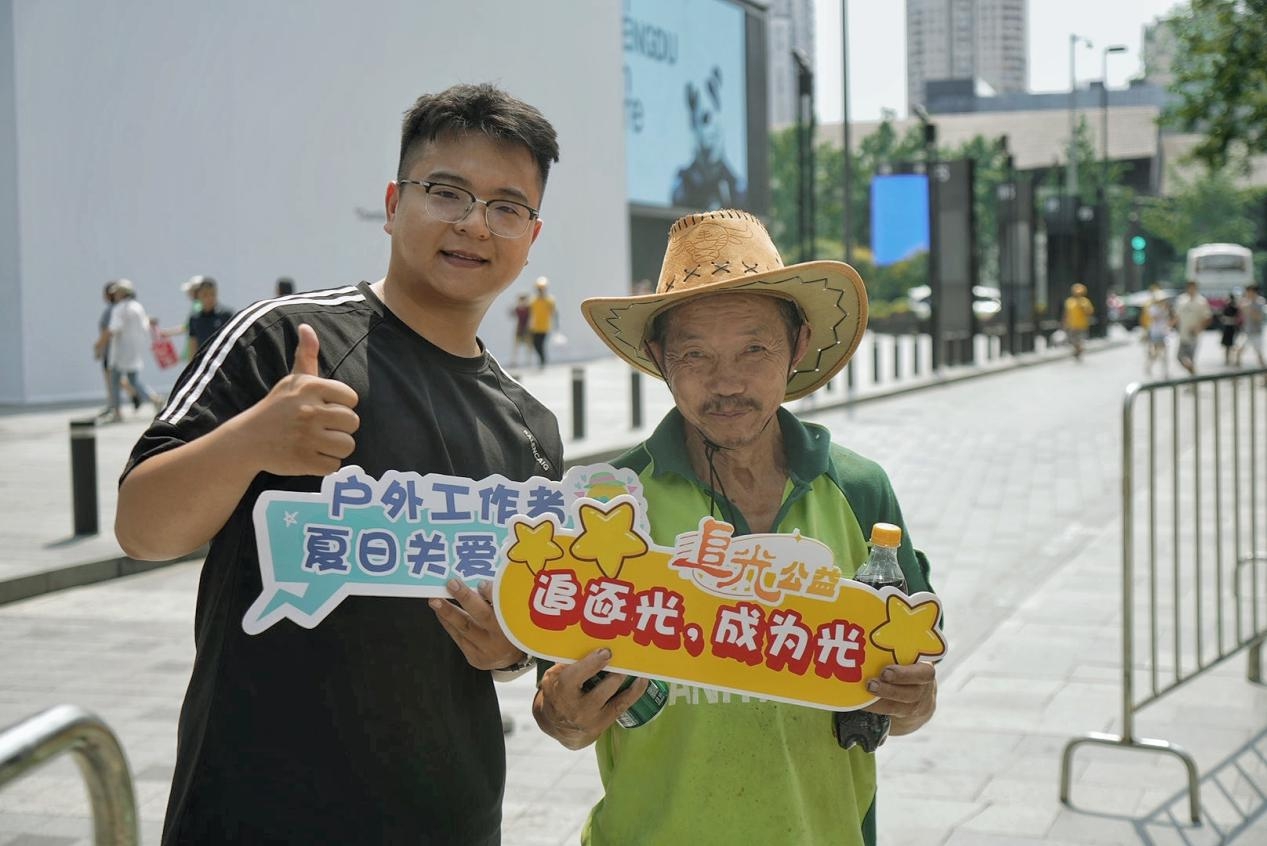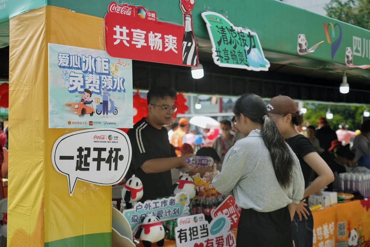 “爱心冰柜”摊位上,公益合作伙伴中粮可口可乐饮料(四川)有限公司准备了充足的饮品,志愿者将爱心水送给来来往往的环卫工人、广场保安等户外工作者,并向前来围观的市民介绍“爱心冰柜”公益活动的初衷和参与方式。