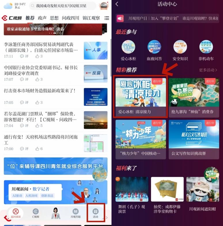 第二步:在川观新闻首页,点击“活动”,找到 “爱心冰柜 清凉接力”活动图片,点击即可参与。