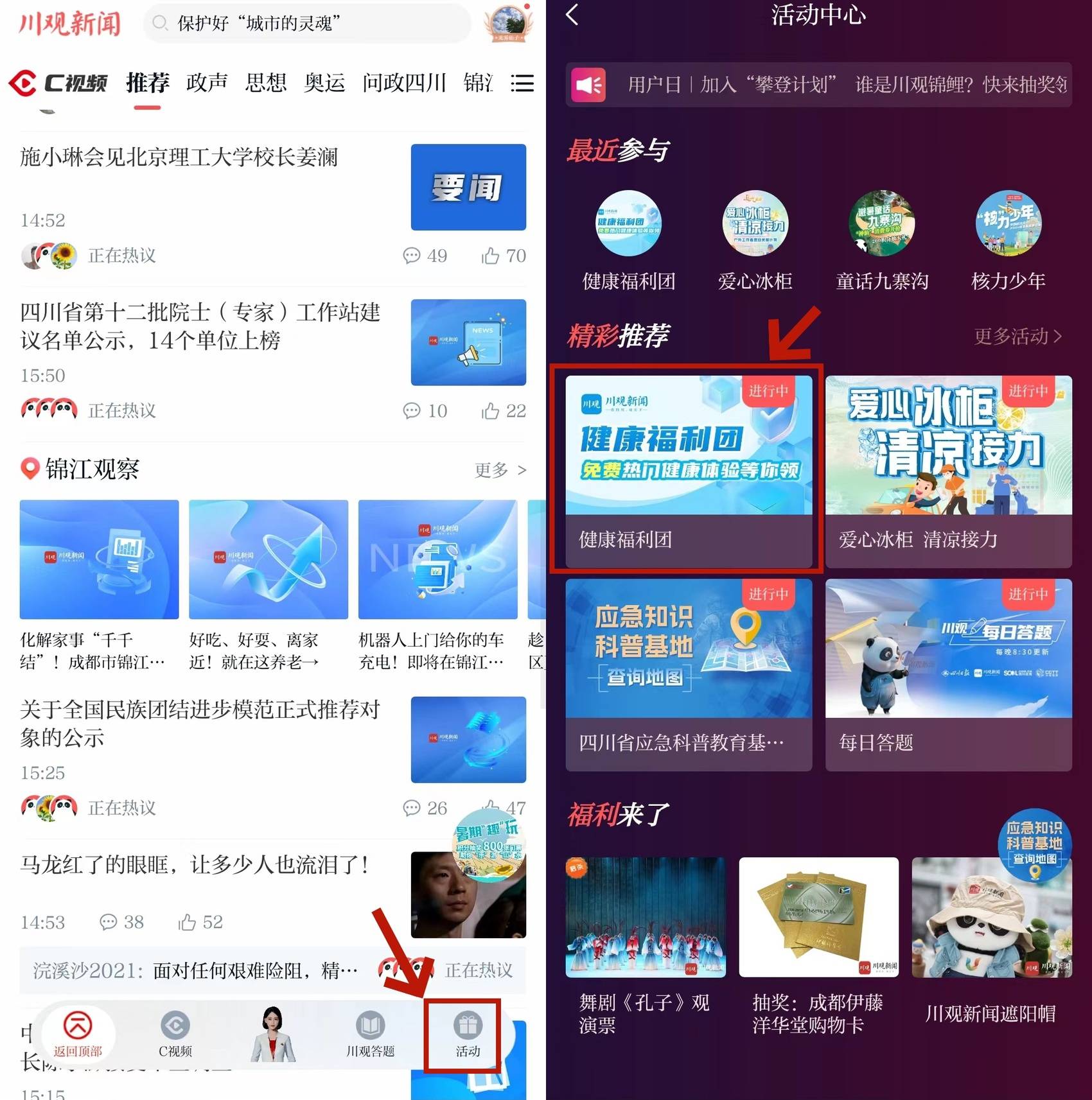 第二步:在川观新闻首页,点击右下角“活动”,进入活动中心,找到“健康福利团”图片,点击即可参与活动。