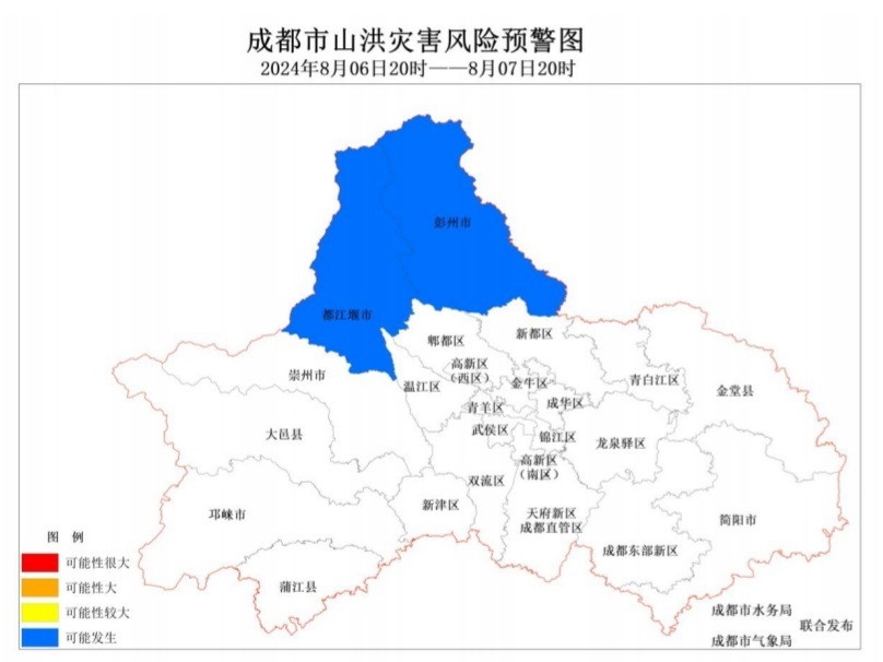 8月6日,按省联合值守预警提示,经成都市水务局、成都市气象局会商研判, 8月6日 20时至7日20时,都江堰市、彭州市可能发生山洪灾害,发布两地蓝色预警。