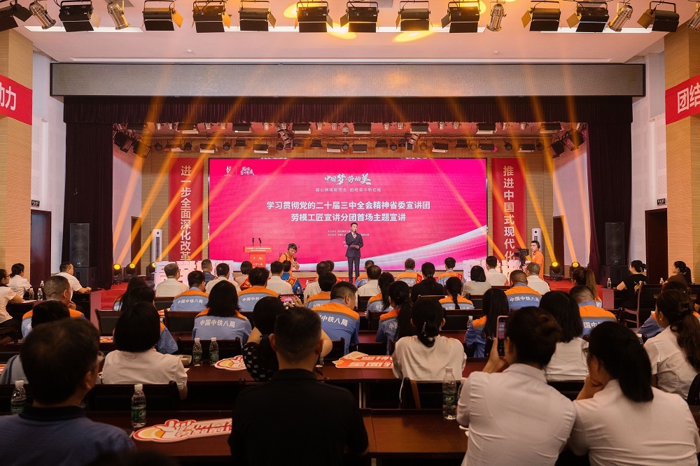 8月8日上午,学习贯彻党的二十届三中全会精神省委宣讲团劳模工匠宣讲分团首场主题宣讲在中铁八局集团建筑工程有限公司举行。3位四川劳模工匠代表曾正超、叶萍、刘尚明身披绶带,先后登台,从自己的成长奋斗故事讲起,谈学习体会、述家国情怀,向现场150余名职工生动宣讲党的二十届三中全会精神。