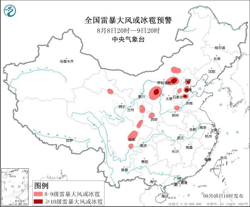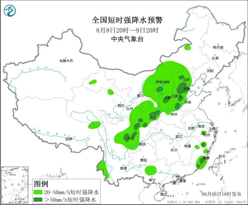 预计8月8日20时至9日20时,西北地区东部、华北北部和东部、四川盆地西部等地的部分地区将有8级以上雷暴大风或冰雹天气,其中,陕西北部、山西北部、河北西北部和东南部、天津北部和南部、山东西北部等地的局地将有10级以上雷暴大风,最大风力可达11级以上;西北地区东部、华北大部、黄淮西北部、四川盆地等地的部分地区将有小时雨量大于20毫米的短时强降水天气,其中,陕西、山西中南部、河北中南部、北京西北部和南部、天津中南部、河南北部、福建东南部、四川东部等地的部分地区小时雨量大于50毫米,最大可达80毫米以上。