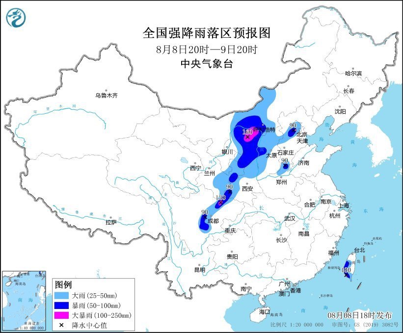 预计,8月8日20时至9日20时,内蒙古中部、甘肃东部、宁夏东南部、陕西北部和西部、山西西部、河北中部、北京中西部、河南北部、四川盆地西部、台湾岛西南部等地部分地区有大到暴雨,其中,内蒙古河套地区、四川盆地西部、台湾岛西南部等地部分地区有大暴雨(100~180毫米)。上述部分地区伴有短时强降水(最大小时降雨量20~50毫米,局地可超过80毫米),局地有雷暴大风等强对流天气。