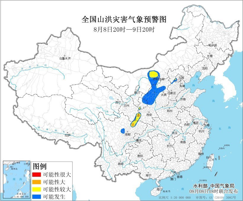 预计,8月8日20时至9日20时,北京西南部、内蒙古西部、四川东北部、陕西西部、甘肃东部等地部分地区发生山洪灾害可能性较大(黄色预警),其中,四川东北部、陕西西部、甘肃东部等地部分地区发生山洪灾害可能性大(橙色预警)。其他地区也可能因局地短历时强降水引发山洪灾害,请各地注意做好实时监测、防汛预警和转移避险等防范工作。