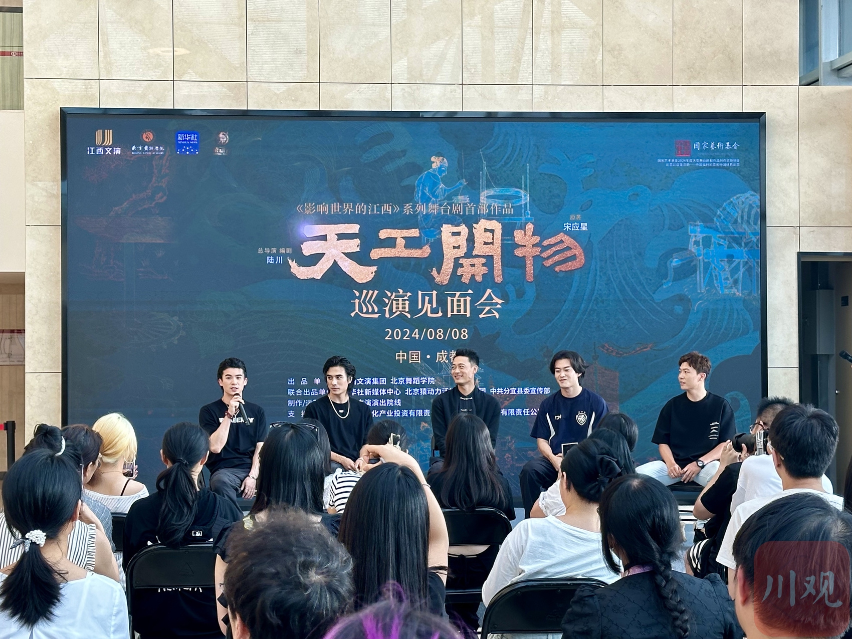 8月8日,跨界融合舞台剧《天工开物》成都站巡演见面会在四川大剧院举行,被粉丝称为“天工男团”的青年舞蹈演员魏伸洲、马蛟龙、吕科镝、胡适、姚亮等来到现场,与成都观众展开互动,分享《天工开物》的创排感受。