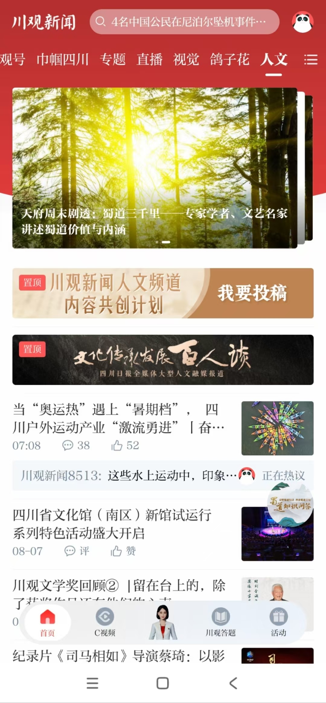 站在新的起点,锚定一流新型主流媒体建设目标,围绕“智能+智慧+智库”的智媒体发展战略,立足于打造全国一流高品质人文报道平台,自8月9日起,川观新闻邀你开启人文内容共创计划,读者可以直接打开川观新闻客户端,进入人文频道,点击投稿通道,即可投稿。