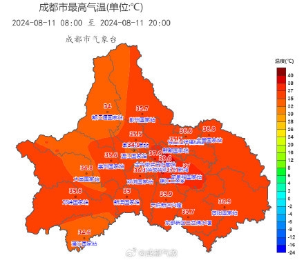 成都市气象台2024年8月11日20时发布气象实况通报:今日白天我市最高气温为34~39.6℃。各区(市)县最高气温具体如下:主城区39.6℃,龙泉驿37℃,简阳36.9℃,金堂36.8℃,青白江36.6℃,双流36.1℃,天府新区35.9℃,东部新区35.7℃,彭州35.7℃,邛崃35.6℃,崇州35.6℃,郫都35.5℃,新都35.5℃,新津35℃,温江34.9℃,大邑34.8℃,蒲江34.6℃,都江堰34℃。