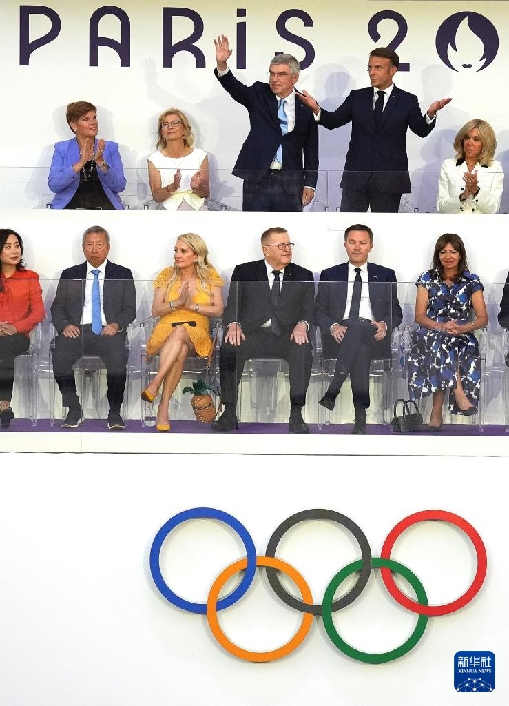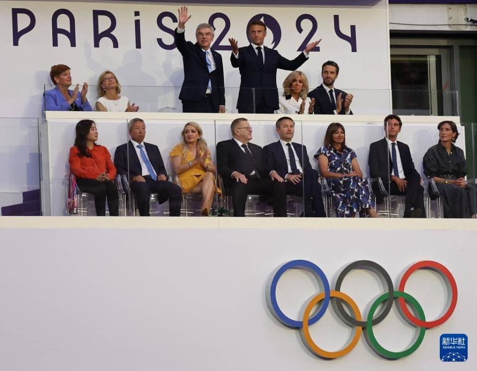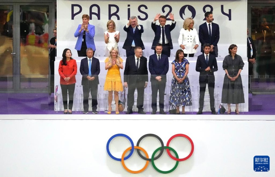 8月11日,国际奥委会主席巴赫(上排左三)与法国总统马克龙(上排右三)出席闭幕式。