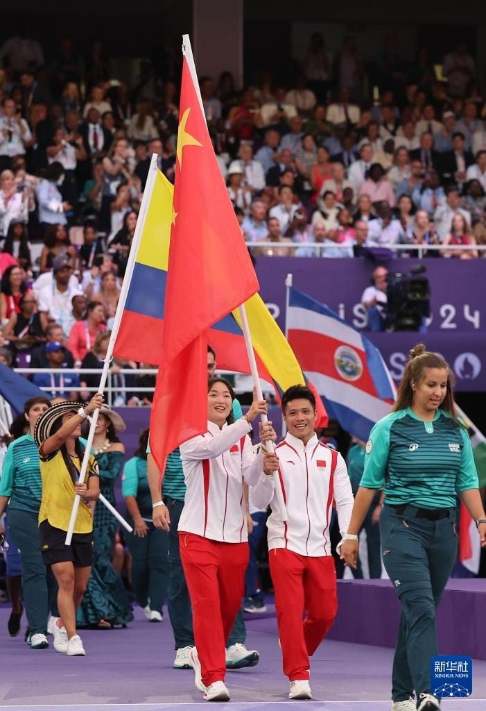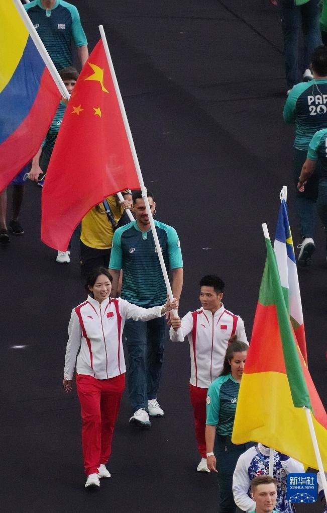 8月11日,中国体育代表团旗手李发彬和欧紫霞入场。