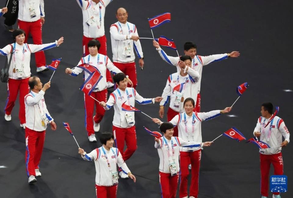 8月11日,朝鲜体育代表团在闭幕式上入场。