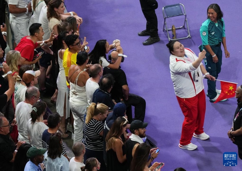 8月11日,中国体育代表团成员李雯雯(右)在闭幕式上与观众合影。