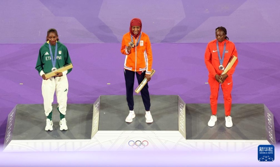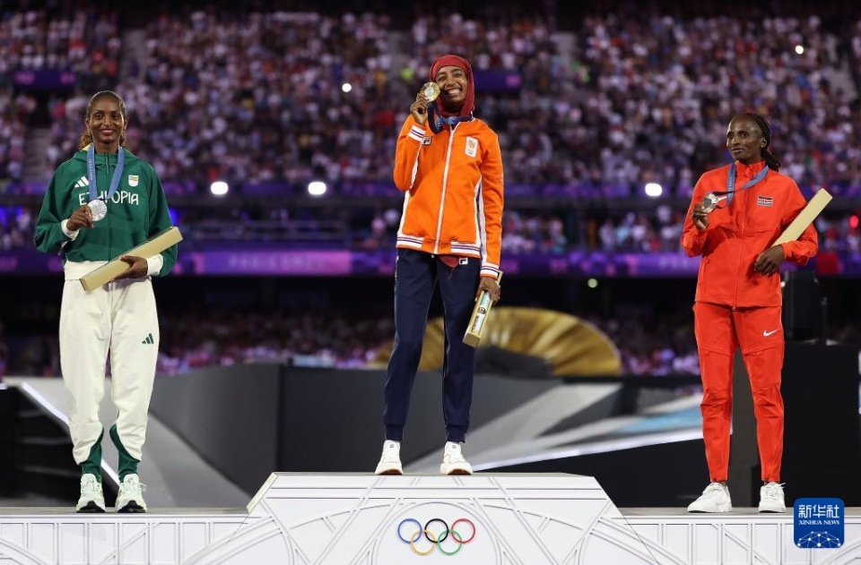 8月11日,女子马拉松冠军荷兰选手茜凡·哈桑在闭幕式举行的颁奖仪式上。