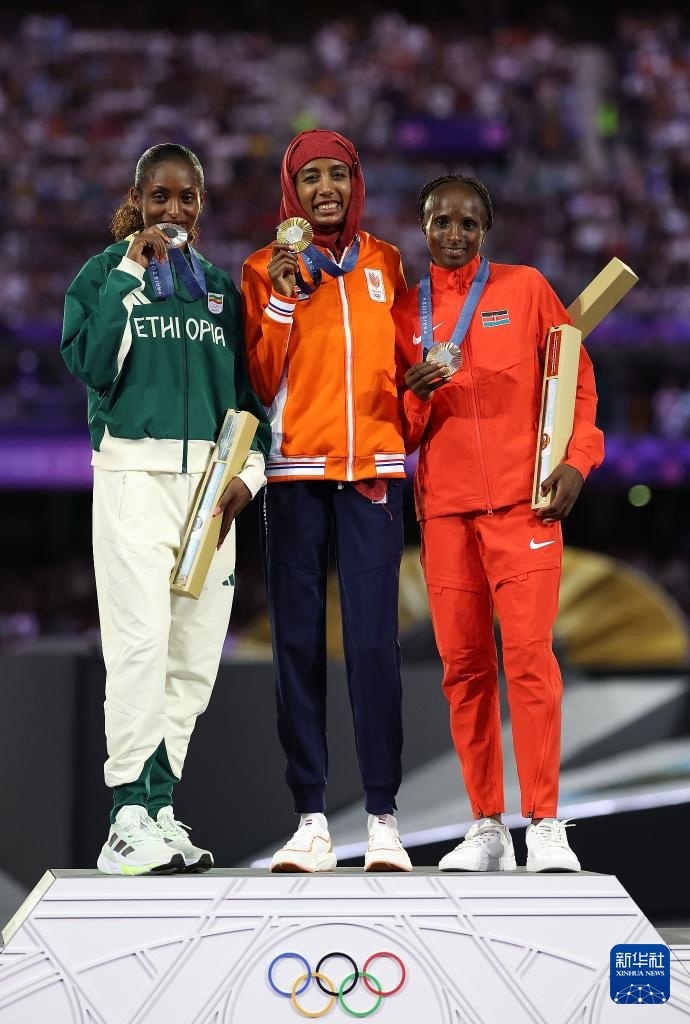8月11日,女子马拉松冠军荷兰选手茜凡·哈桑(中)、亚军埃塞俄比亚选手蒂格瑟特·阿塞法(左)和季军肯尼亚选手海伦·奥比里在闭幕式举行的颁奖仪式上。